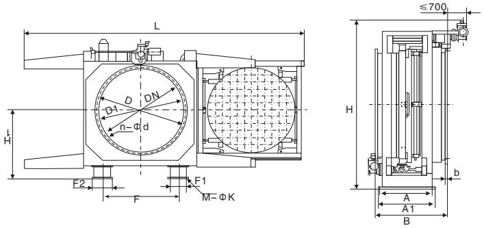 | DN | D | D1 | B | b | n-d | H | H1 | L | A | A1 | F | F1 | F2 | M-K | 電動功率(kw) | 質(zhì)量(kg) | ||||